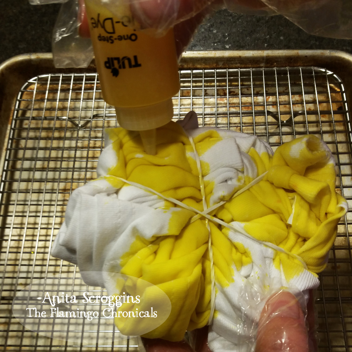 Make sure you put the gloves on for this step. Really. Learn from me young Jedi. Add water as directed on the bottles and shake, making sure you still have the cap on. You will add the first color to every other section and then fill in with the second color. I like to do this step on a cookie sheet with a rack. That way if I have to put the shirt down it is on the rack, rather than sitting in the dye.